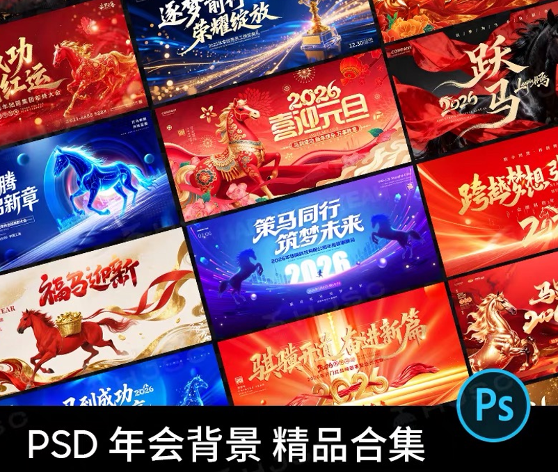 2026企业年会马年新年晚会颁奖典礼舞台背景签到处KV主视觉素材PS