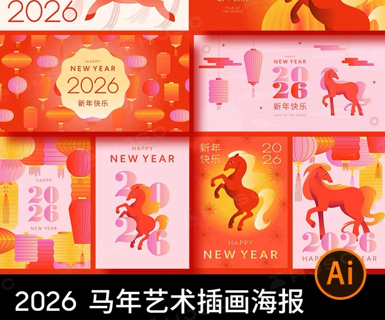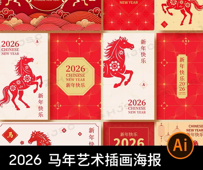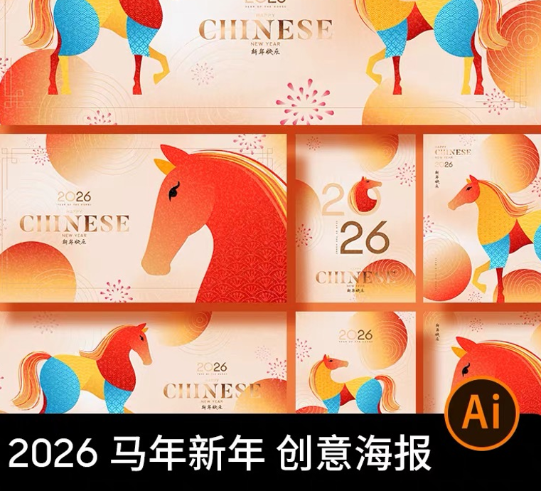 2026新年马年图案春节简约系列节日海报展板背景图AI矢量设计素材