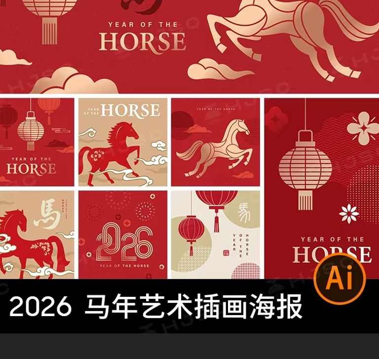 2026马年高级简约艺术新年春节系列插画海报背景ai矢量设计素材图