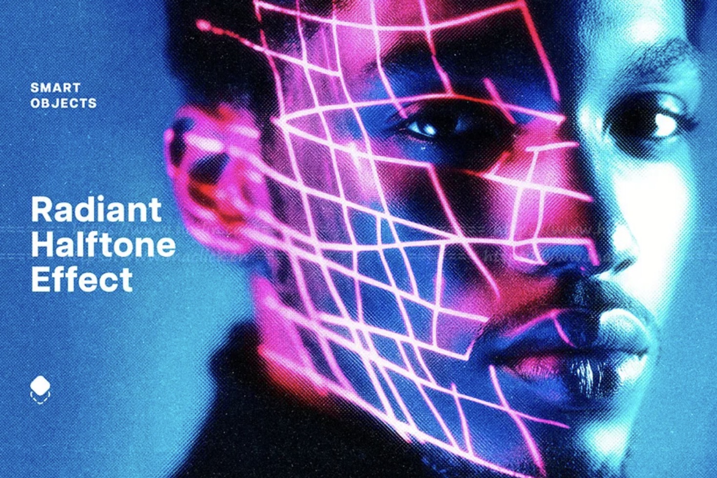 【PSD模板】霓虹辐射线发光半色调照片效果PS特效模板