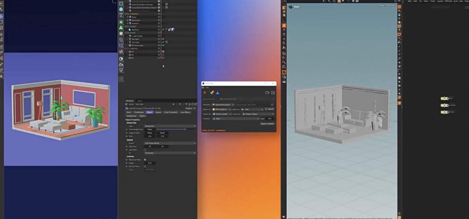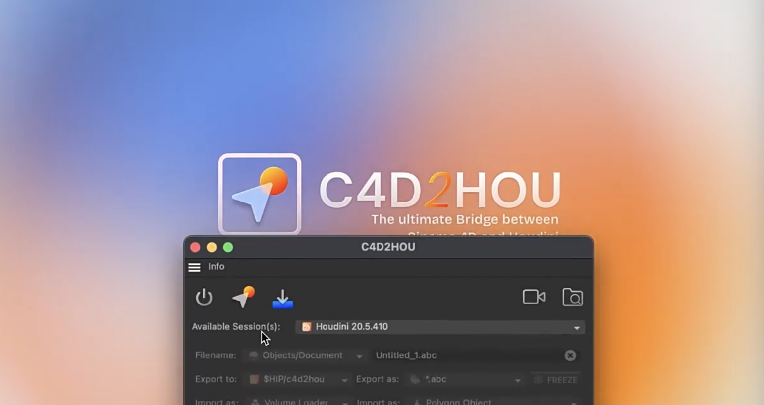 无缝连接 Cinema 4D 和 Houdini,支持导出/导入几何体、样条线、摄像机、体积模拟等。格式支持:Alembic、FBX、VDB