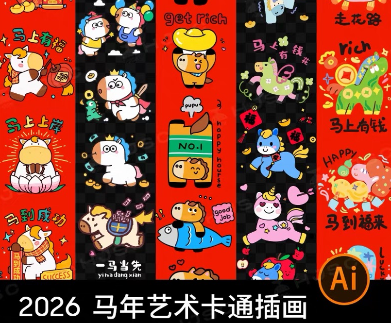 2026马年新年春节趣味可爱卡通IP形象贴纸插画图案ai矢量设计素材