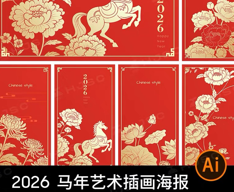 2026马年春节新年花卉图案艺术简约红金色海报背景AI矢量设计素材