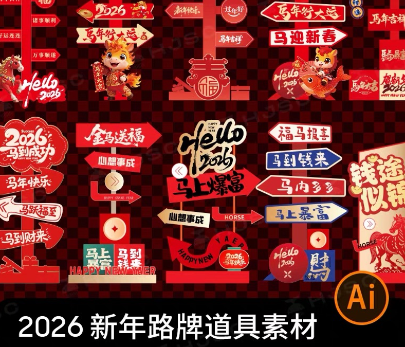 2026新年马年春节美陈物料路牌指示牌拍照打卡道具ai矢量设计素材