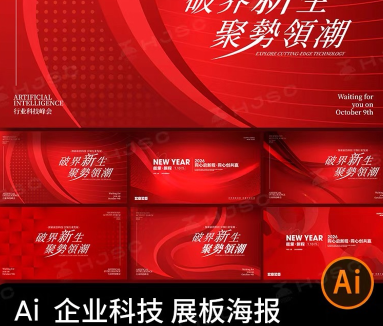 2026新年企业年会科技展板KV主视觉海报红色背景ai矢量设计素材图