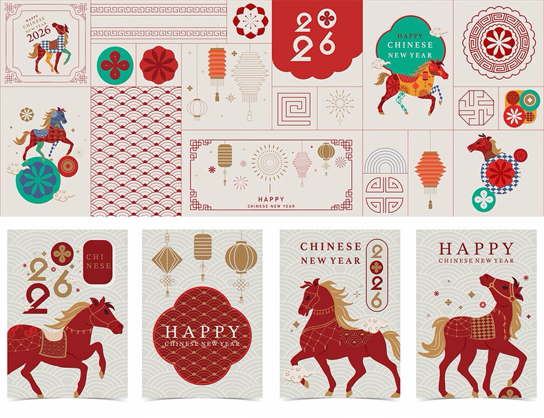 2026马年新年春节创意扁平风艺术系列海报ai矢量插画设计素材模板