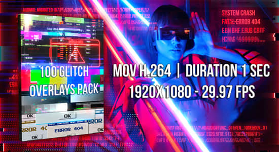 包括100种不同的毛刺效果视频动画,可以组合使用它们以产生更多变化。使用混合模式覆盖片段,以创建故障,噪波或系统错误转场过渡等。
