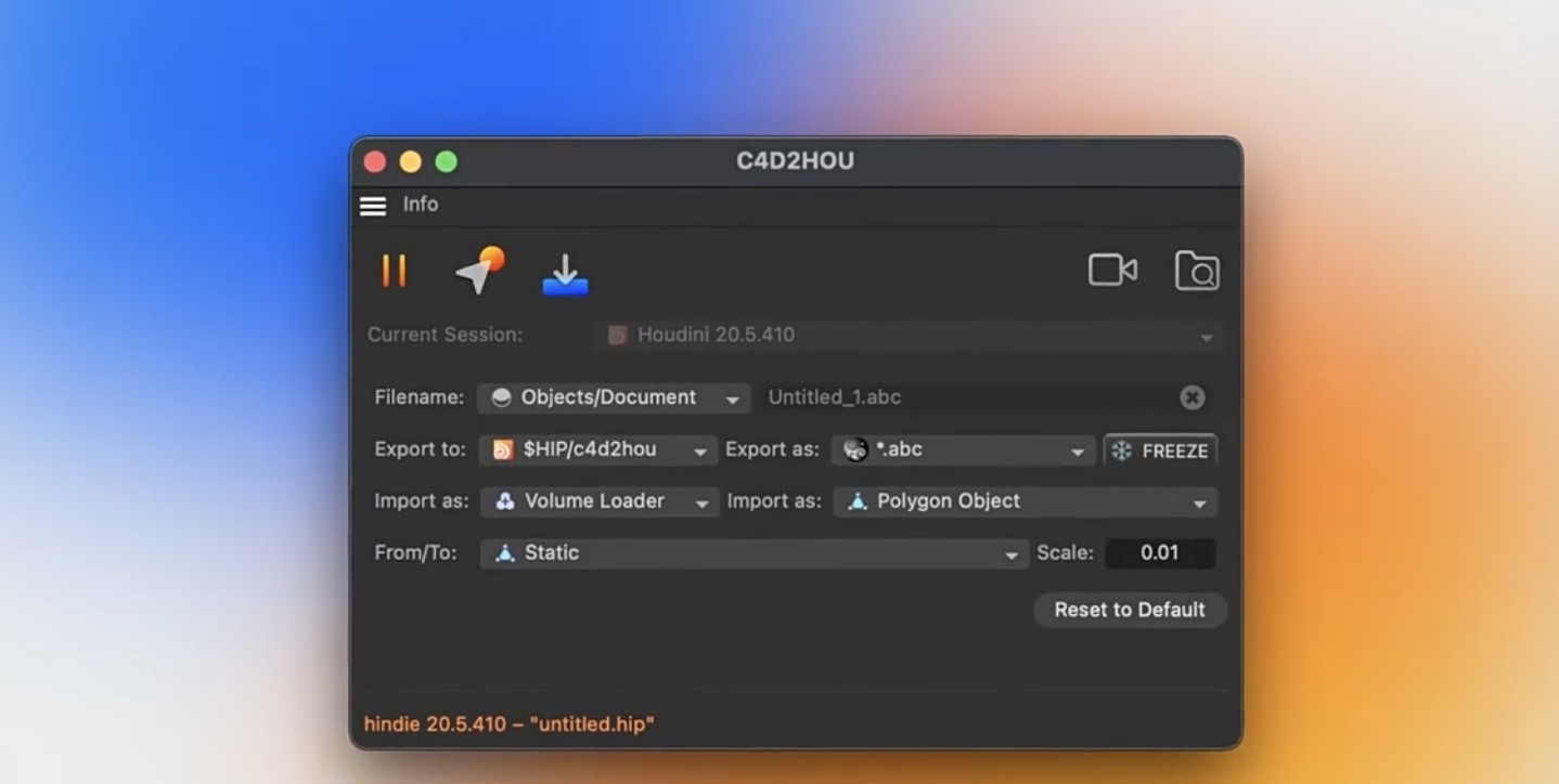 无缝连接 Cinema 4D 和 Houdini,支持导出/导入几何体、样条线、摄像机、体积模拟等。格式支持:Alembic、FBX、VDB