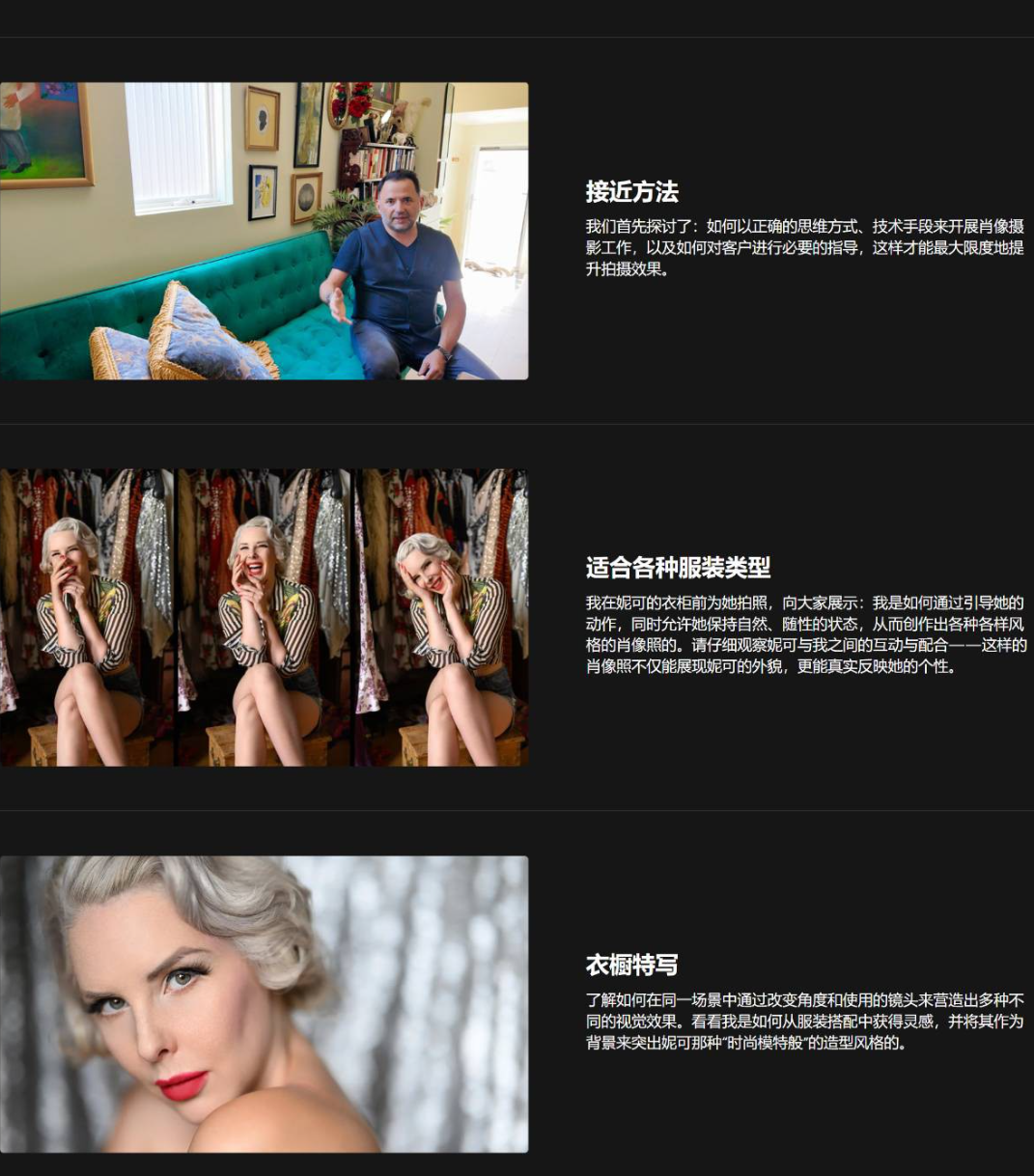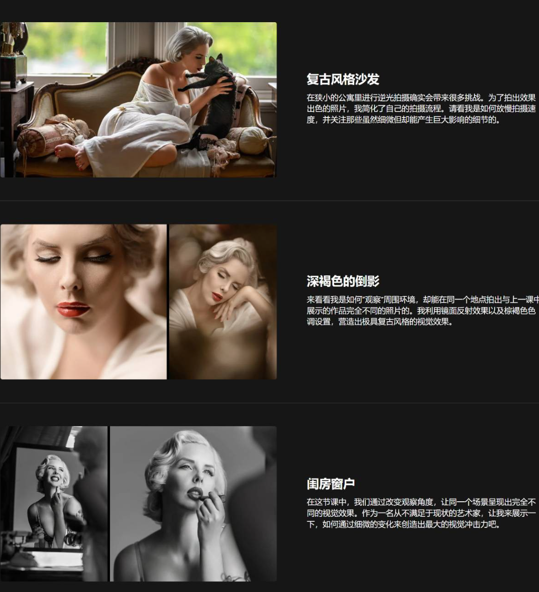 英文+中英字幕|1080P 了解如何将小空间打造成工作室环境,并学习我的5步方法,每次都能拍摄出令人惊艳的照片。 必备器材讲解 如何摆姿势 利用自然光 运用反射效果 创意场景 2小时28分钟专业培训 7个幕后项目