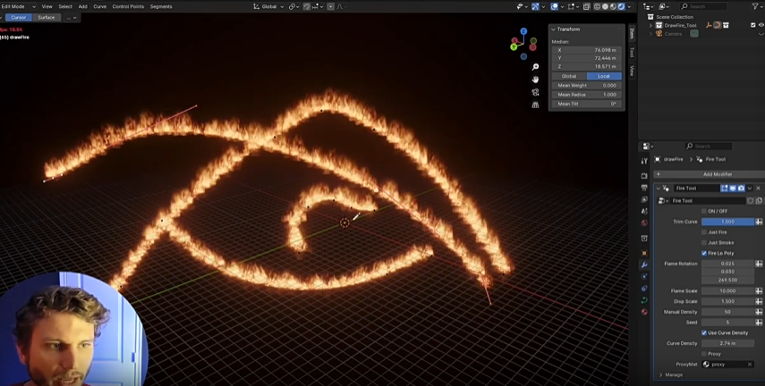 在Blender中轻松沿曲线路径创建实时火焰!这款工具允许您绘制和操控曲线,从而获得炫酷的效果!它内置自定义设置,让您可以根据需要调整火焰效果。这款工具为您提供真正可控的实时火焰效果! 该工具可实例化低多边形对象,并为其映射火焰和烟雾材质。由于未使用烟雾或火焰模拟,因此可节省渲染时间!该工具针对 EEVEE 进行了优化,只要在光路中提高透明通道的强度,它在 CYCLES 中也能很好地工作。
