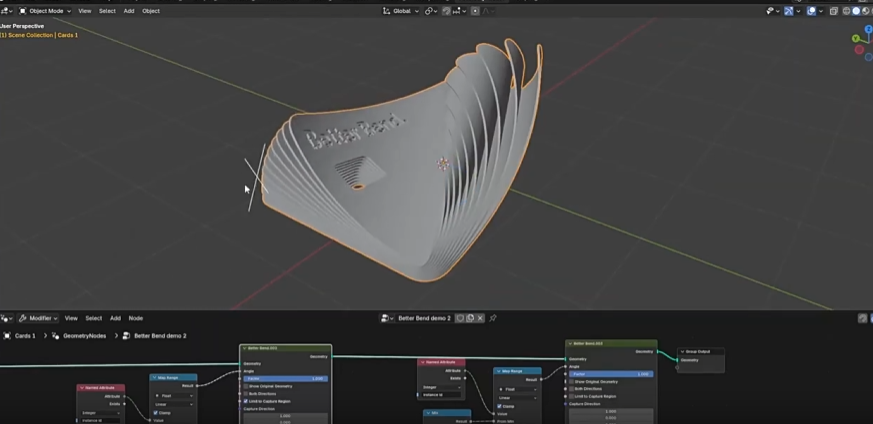 Better Bend 是一个基础弯曲节点工具,用于更干净、可控地弯曲几何体,替代 Blender 默认的 Simple Deform 弯曲方式。与传统方法不同,它提供可视化控制柄,让用户在视图中直接设定弯曲起点、终点、方向等参数,并通过节点系统保持非破坏性程序化变形,适合在建模、动画、产品展示等流程中反复调整和批量应用。
