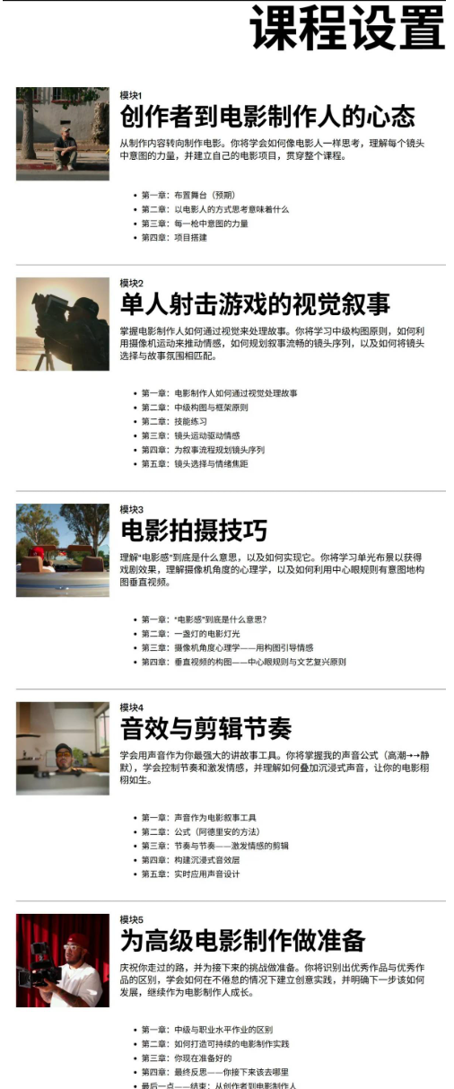 你已经掌握了基础知识。现在是时候理解为什么这一切如此重要了。学习摄像机角度、焦距背后的理论,以及一帧如何即使微小的改动也能传达出如此多不同的情感。我会教你如何像电影人一样思考,让你的作品从“好”变成电影感。课程设置创作者到电影制作人的心态模块1创作者到电影制作人的心态从制作内容转向电影创作。你将学会如何像电影制作人一样思考,理解每个镜头中意图的力量,并建立自己的电影项目,贯穿整个课程。单人游戏的视觉叙事模块2单人拍摄游戏的视觉叙事掌握电影制作人如何通过视觉来处理故事。你将学习中级构图原则,如何利用摄像机运动来驱动情感,如何规划叙事流畅的镜头序列,以及如何将镜头选择与故事氛围相匹配。电影拍摄技巧模块3电影拍摄技巧理解“电影感”到底是什么意思,以及如何实现它。你将学习单光布置以获得戏剧效果,理解摄像机角度的心理学,以及如何用中心眼规则有意图地构图垂直视频。音效与剪辑节奏模块4音效与剪辑节奏学会用声音作为你最强大的叙事工具。你将掌握我的声音公式(高→潮→沉默),学会如何控制节奏和节奏以激发情感,并理解如何叠加沉浸式声音,让你的电影栩栩如生。为高级电影制作做准备模块5为高级电影制作做准备庆祝你走过的路,为接下来的路程做好准备。你将识别出优秀作品与优秀作品的区别,学会如何在不倦怠的情况下建立创意实践,并明确下一步该如何继续成长为一名电影制作人。